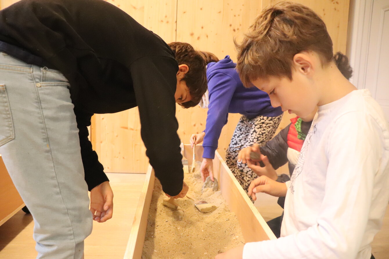 Après avoir fouillé dans un bac de sable pour trouver un fossile, chaque enfant se glisse dans la peau d’un paléontologue. Il remplit la fiche d’identité de sa trouvaille grâce à des ateliers en autonomie où il est encouragé à pratiquer une démarche scientifique. La mise en commun des recherches des élèves permet de reconstituer les variations de l’environnement alsacien depuis 420 millions d’années !
